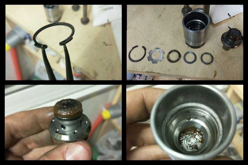 Потом разобрал поршень суппорта, для этого снял стопорное кольцо. Дальше все детали по порядку вынул из стакана поршня. Также почистил и собрал обратно. Внутри было немного бяки.